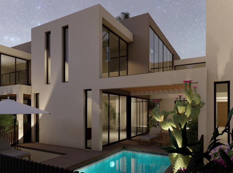 The project you see was designed by www.lordosarchitects.com to provide Seven beautifully designed contemporary family homes with swimming pools. For more information please contact us.