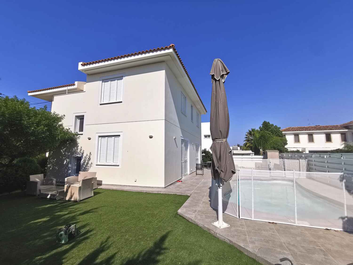 This well-presented 4 bedroom family house is located in a very quiet cul-de-sac in a quiet residential area within close proximity to schools, supermarkets and the center of Nicosia. Internally the property offers 250sqm of living, dining an entertaining areas and ample external space with a very well maintained garden with a swimming pool.