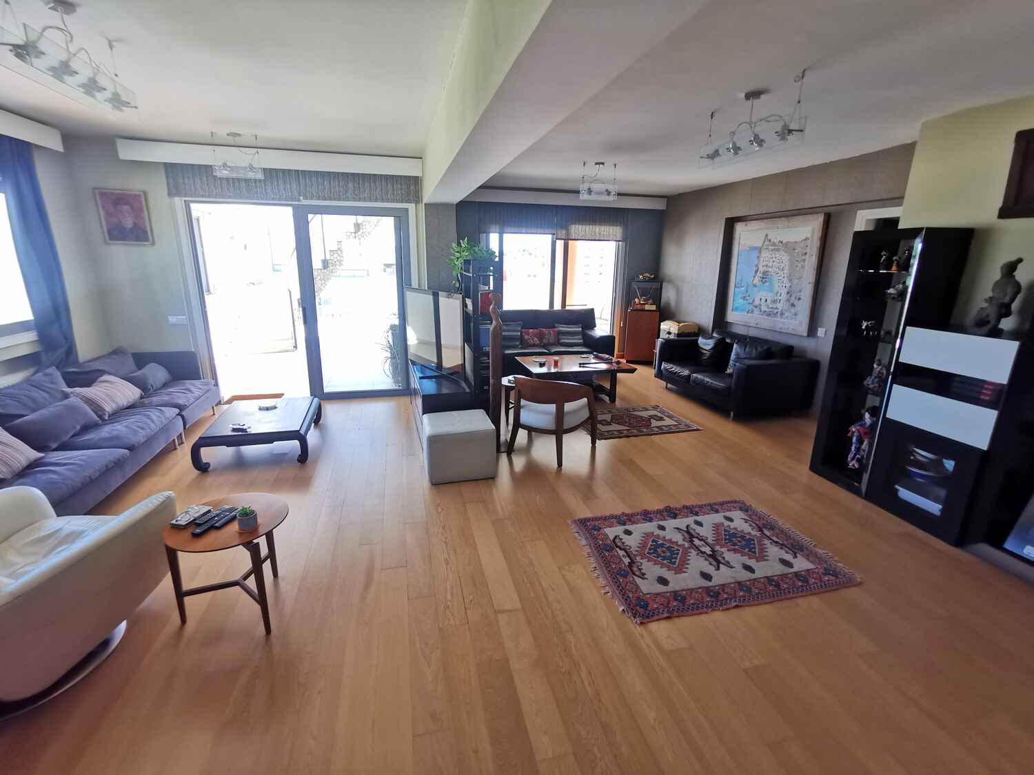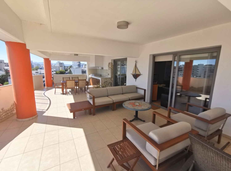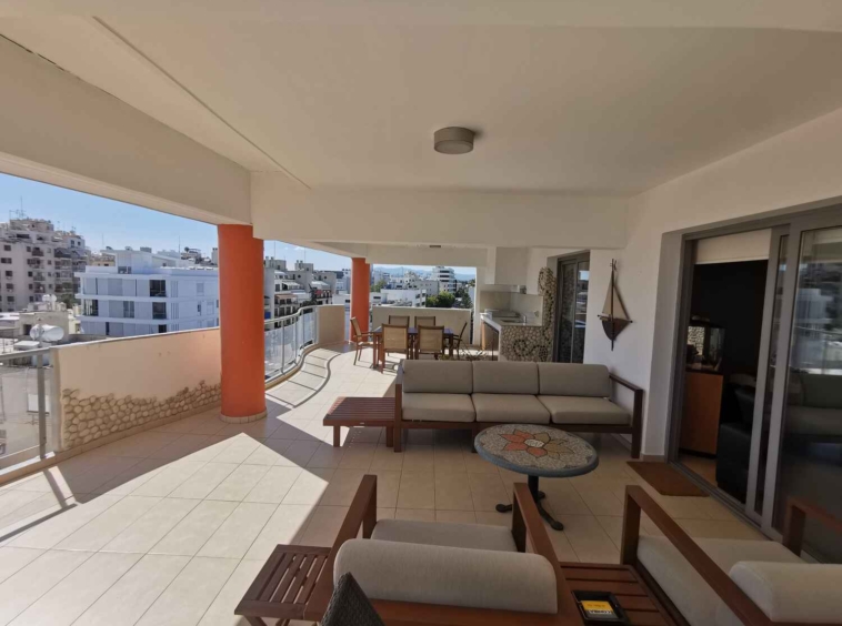 This beautiful penthouse apartment is located on the boundaries of Engomi and Strovolos close to the European University of Cyprus. Occupying the entire 4th and offering 180sqm of living space with 3 bedrooms and 2.5 bathrooms, large living area, kitchen, dining room and a superb 70sqm covered veranda which can be enjoyed 365 days of the year with fantastic views over Nicosia. There is also a staircase from the veranda that leads up to the 5th floor where you have a private roof garden of 100sqm along with a seperate maids apartment and laundry room. The apartment has title deeds and 2 covered parking spaces.
